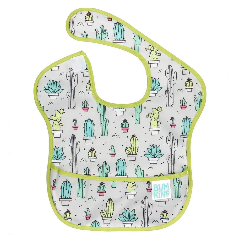 The SuperBib attaches over the back of the shoulder with hook and loop closure for a quick, adjustable and tug-proof fit. With a handy crumb catcher / catch-all pocket for containing spills. Made from Bumkins lightweight, waterproof, easy-wipe, stain and odour resistant fabric. Single ply construction means no worrying about icky stuff growing between layers of fabric. Without a cotton layer, stains and smells don't stick.